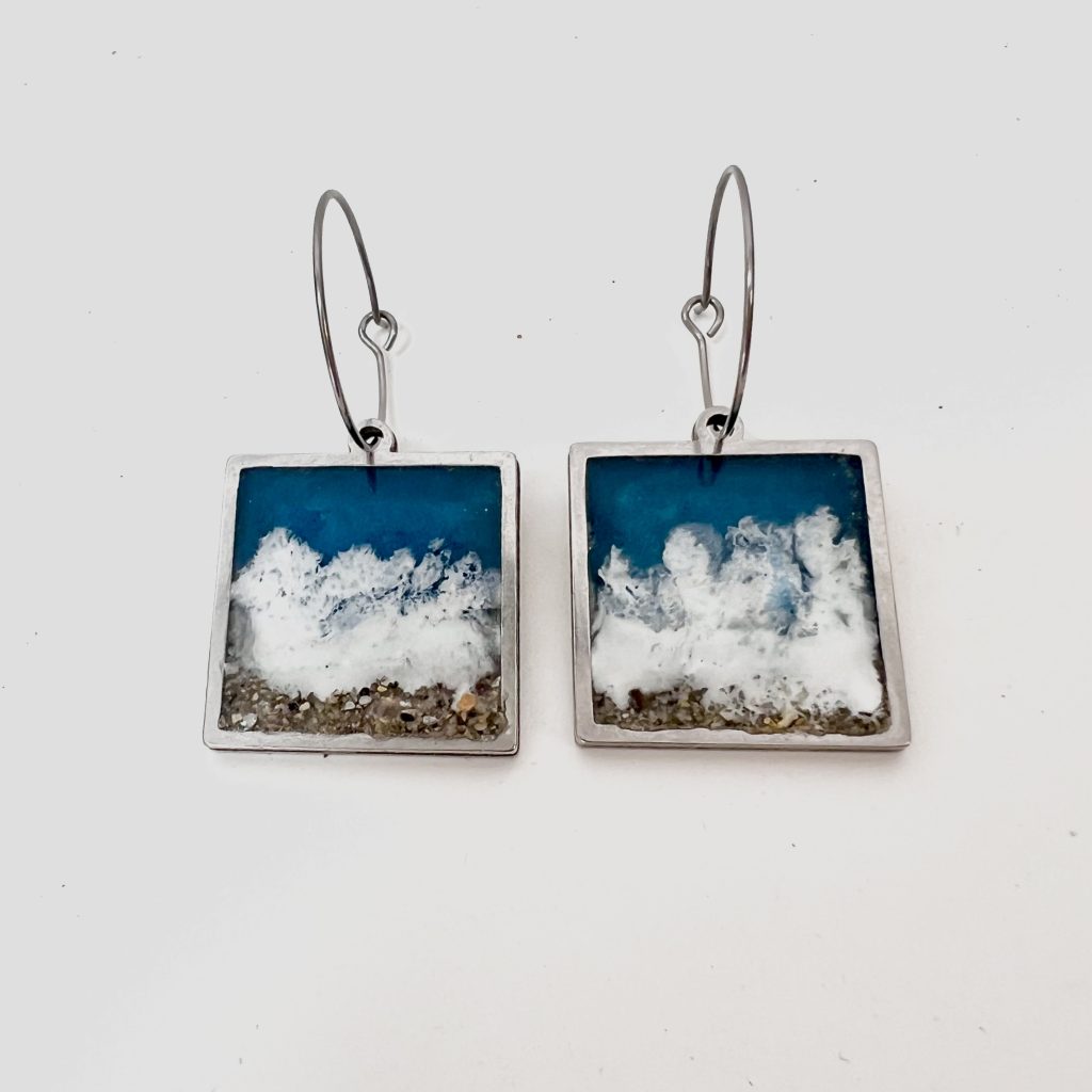 Aros de acero inoxidable con un cuadrado de mar que simboliza la serenidad del horizonte al atardecer. Una pieza diferente, geométrica y artesanal que une modernidad y naturaleza.